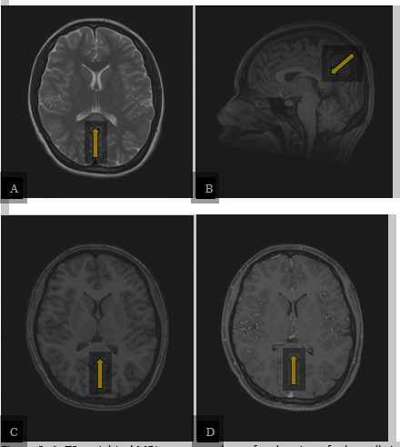 Figure 2: A. T2-weighted MRI sequence shows focal region of edema (bright signal) within the splenium of the corpus callosum in the midline (arrow). B. and C. This lesion was dark on T1-weighted sequence (arrows). D. The lesion showed no enhancement following intravenous contrast administration on the T1 post-contrast sequence (arrow). The rest of the brain was normal.
